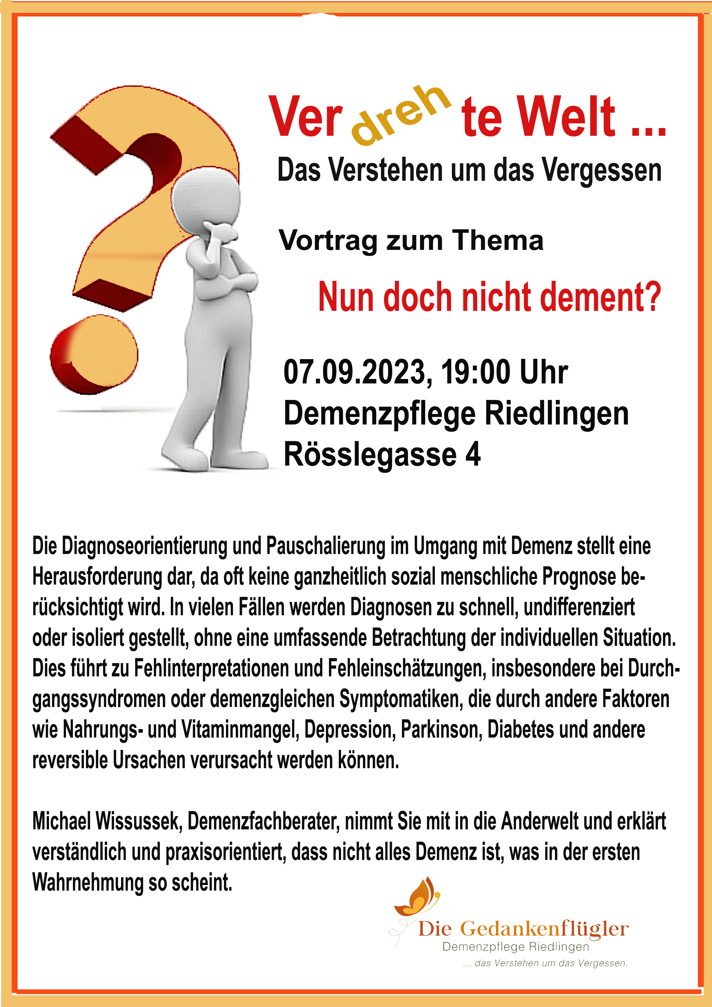 Vortrag von Michael Wissussek, am 07.09.2023, ab 19:00 Uhr in der Demenzpflege - Riedlingen. Eintritt frei.