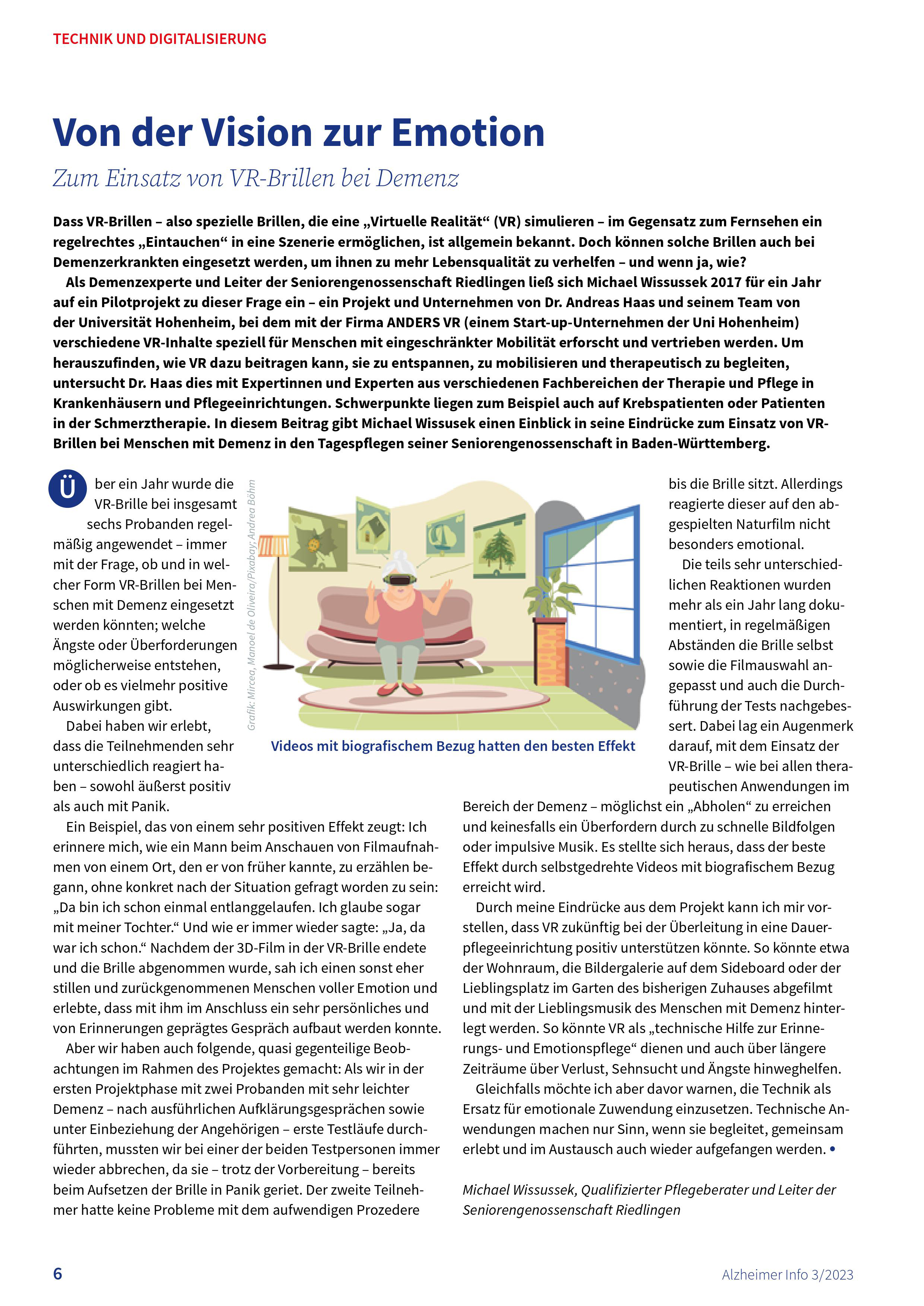 30 August 2023Artikel der Deutschen Alzheimergesellschaft Von der Vision zur Emotion Bericht über die Anwendung von VR-Brillen bei Demenz. Autor: Michael Wissussek